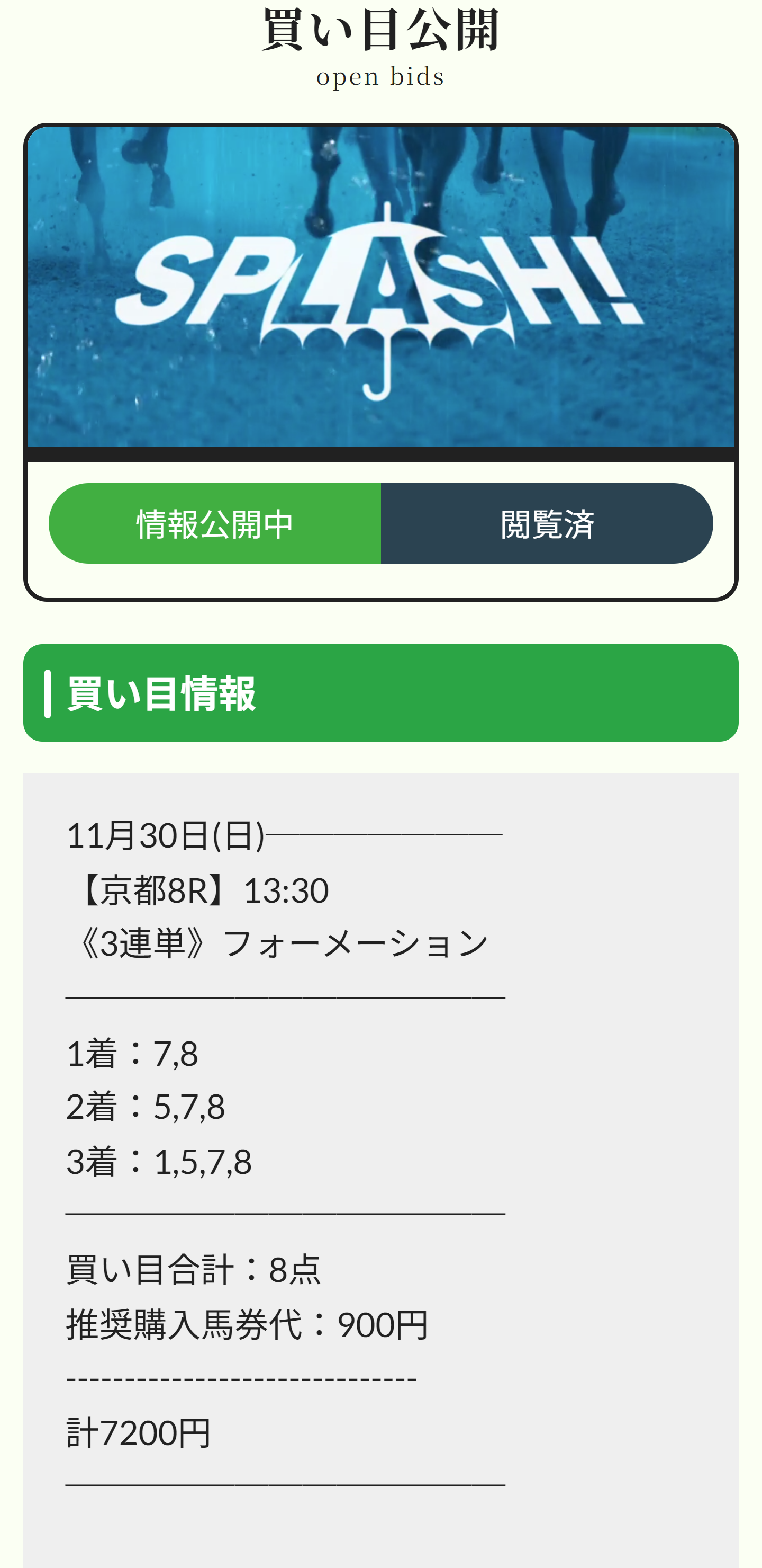 子どもの習い事が土曜の午前にあるので、平日の夜にスプラッシュを買っておいたんですが、これがドンピシャでした。京都8Rの8→5→1で3連単50,300円。900円で買っていたから452,700円。40代会社員の自分が土曜にスマホ握りしめて固まったのは言うまでもありません。