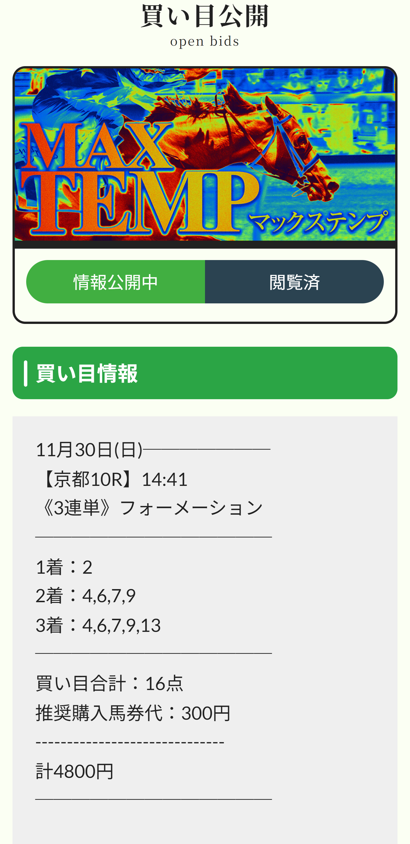 平日の朝、珈琲飲みながら落ち着いて買っておいたマックステンプが、その週末に炸裂しました。退職後の60代ということもあって競馬は楽しみのひとつなんですが、京都10Rの2→9→13が3連単218,250円。1点300円なので654,750円。年金生活にこれは大きすぎる臨時収入です。