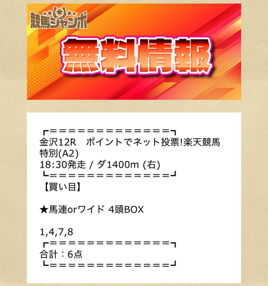 この日は川崎11Rで重賞「スパーキングサマーカップ」があったので現在高確中状態に突入している競馬ジャンボもこのレースの買い目を提供してくれるかと思ったら