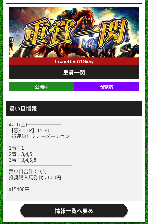 その中で重賞一閃は、無理に大穴へ振らずに、1番人気のエンブロイダリーをきっちり頭に据えながら、2着4番人気、3着5番人気で3連単15,310円を取ってきたのが良かったです。GⅡの阪神牝馬Sでこの形をちゃんと仕留めて、戻りは91,860円。爆発力だけを見せる情報じゃなくて、「注目レースでもちゃんと形にする」タイプの安心感がありました。夫に言ったら珍しく「それは買い方うまいな」って返ってきて、そこもちょっと気分よかったです。