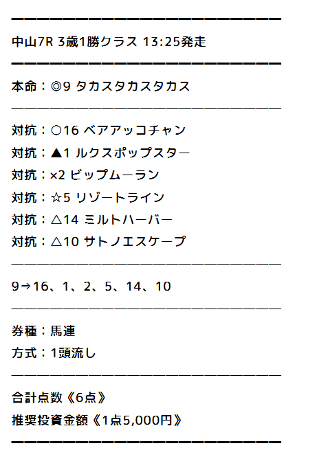 中山7Rの無料予想で、馬連6点を1点5000円。こういう買い方って軸がズレたら痛いのに、ちゃんと⑨タカスタカスタカスを頭で見て、2着の②ピップムーンまで拾ってきたのは普通にうまいです。